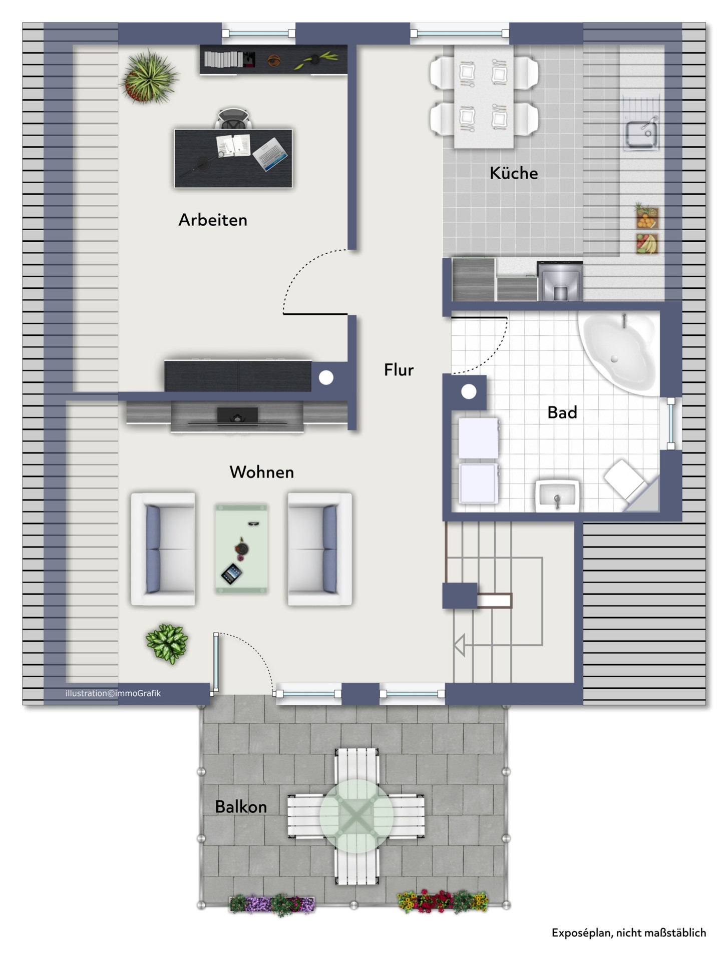 Wer nicht im großen Garten sitzen will nutzt ein weiteres Highlight des Hauses, den großzügigen, überdachten Balkon zur Gartenseite hin. Er eignet sich ideal für erholsame Stunden im Freien.